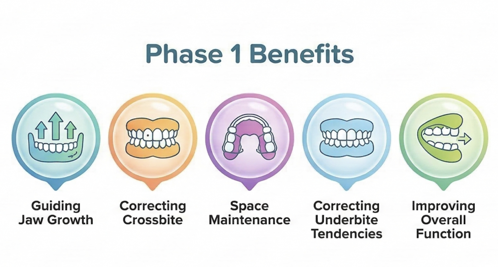 Rather than fully straightening every tooth at this stage, Phase 1 treatment focuses on guiding growth and creating a healthy foundation for the permanent smile.